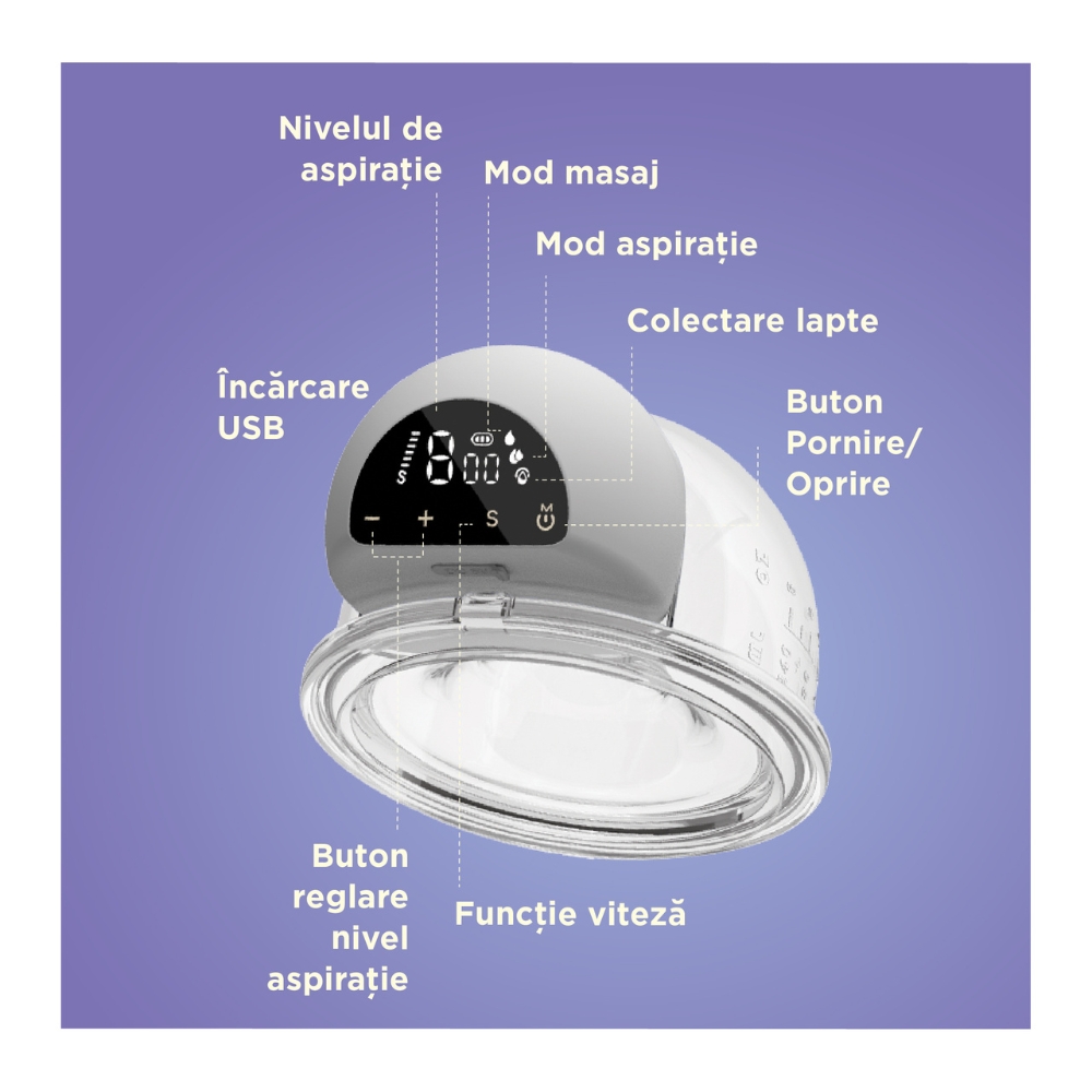 Designul compact și portabil permite utilizarea discretă, oriunde te afli: acasă, la birou sau în deplasare, oferind o experiență practică și sigură pentru colectarea laptelui matern.